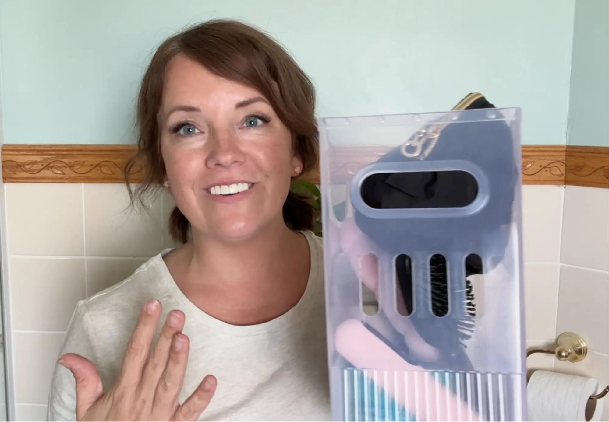 Il ne contient que les choses que j'utilise tous les jours : mon maquillage, mes soins de la peau, ma brosse à cheveux, mon déodorant et quelques autres éléments essentiels. Quand j'ai fini de me préparer, tout retourne dans le bac et se glisse sous l'évier. Il est rapide à retirer, facile à ranger et garde les comptoirs dégagés (ce qui me permet aussi d'avoir l'esprit un peu plus clair !).